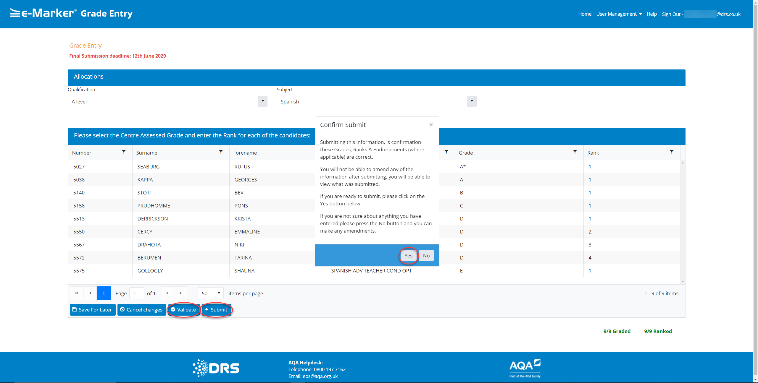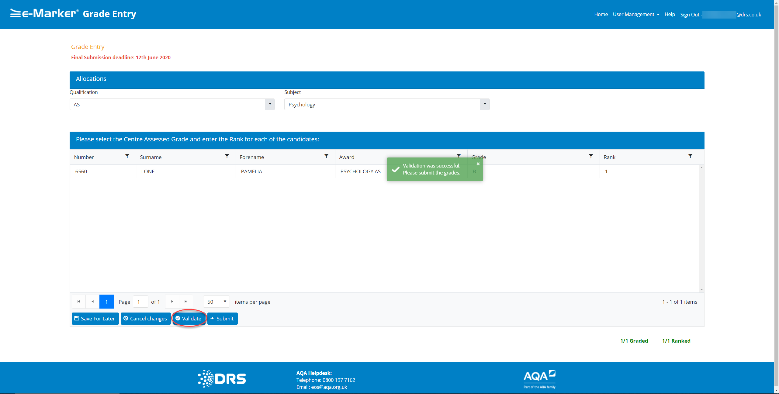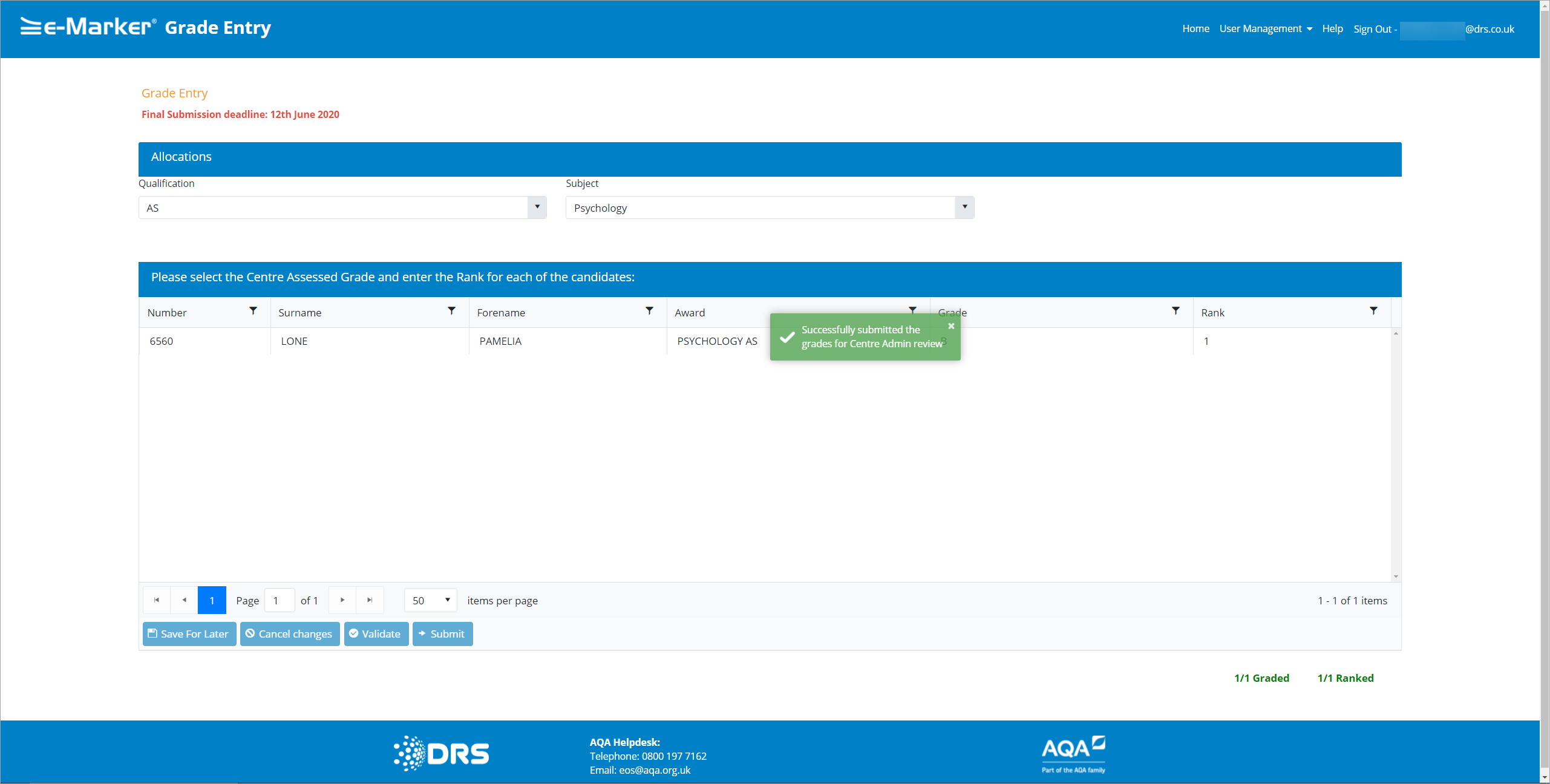 Note: The Submit button is only enabled when the Validate button has been clicked and the entire cohort has a Grade and Rank, and Ranking has no Grade/Rank Duplicates). Once confirmed, the Centre/Subject set is submitted to the Award Body.