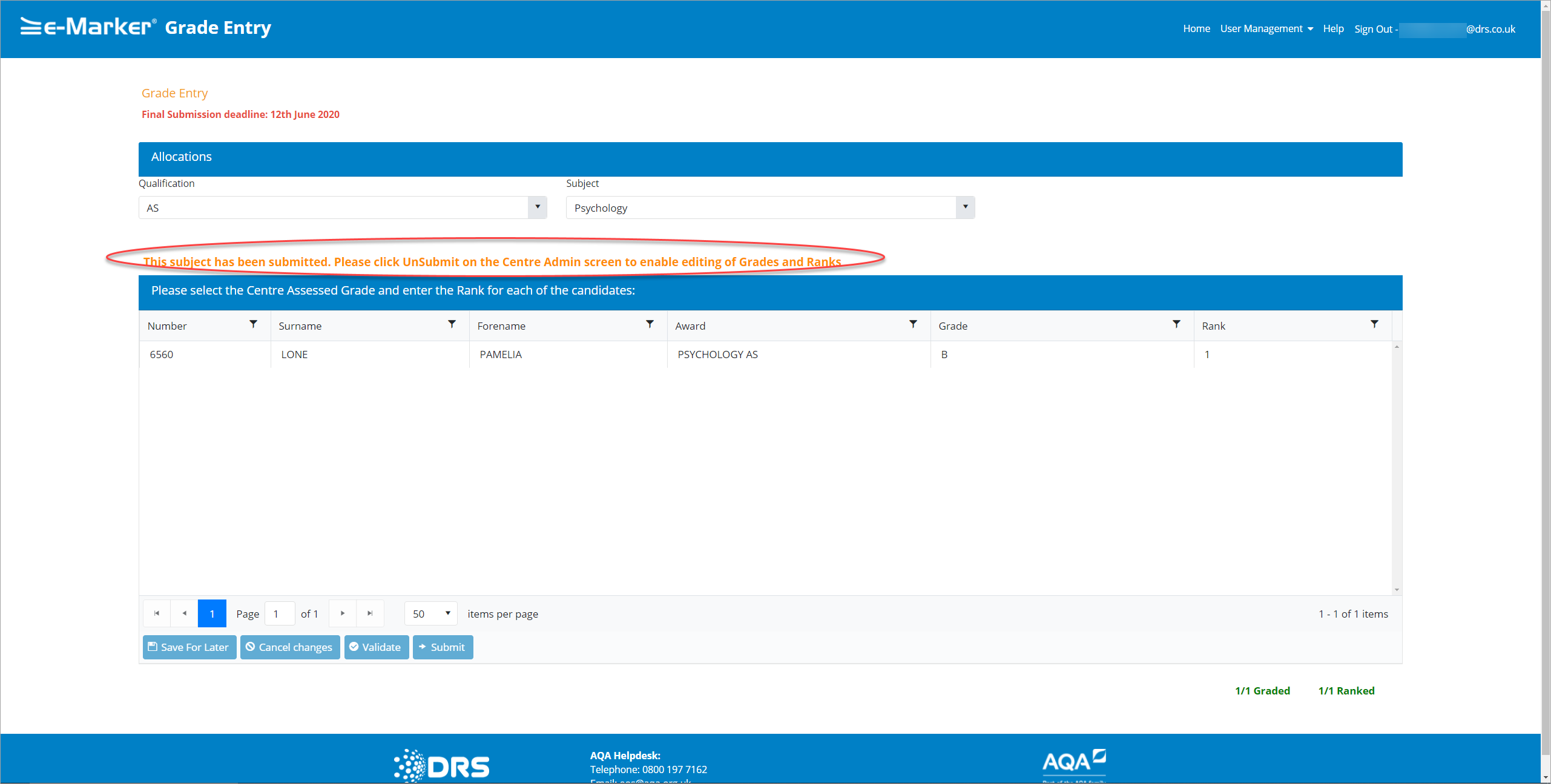 Warning: You cannot edit the Grade/Rank after it has been submitted. If you want to amend details, you must unsubmit the Subject.