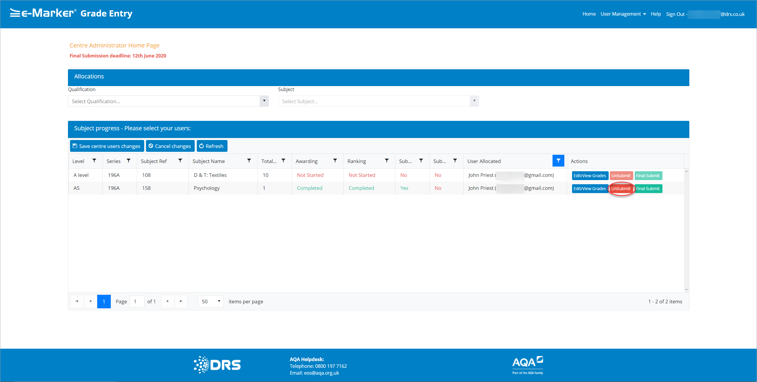 Centre Administrators can use the Unsubmit button to roll back Submissions, which enables the editing of the Grade or Rank.