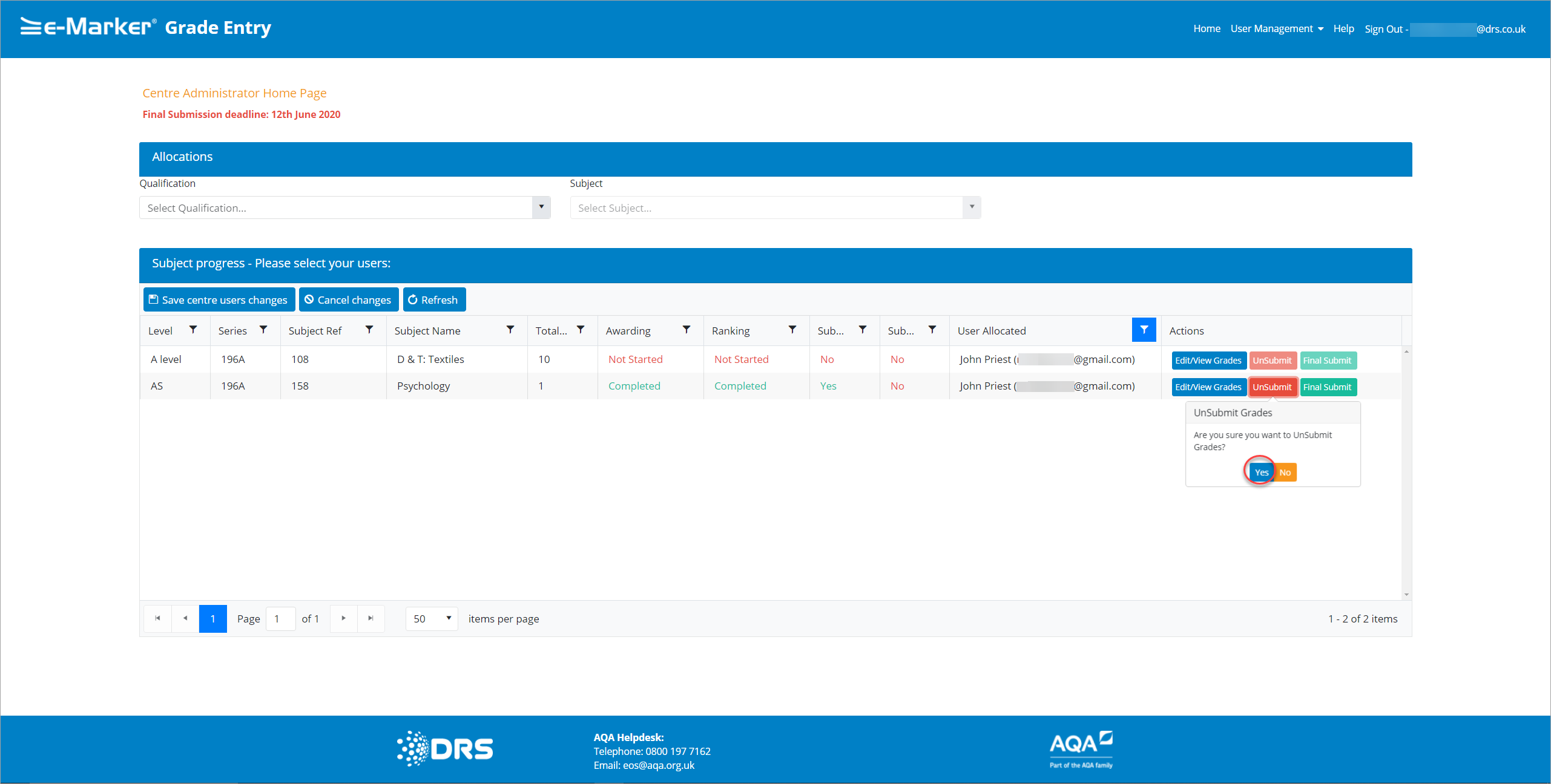 To submit Grades as Centre Administrator, for a selected Centre/Subject, follow these steps: